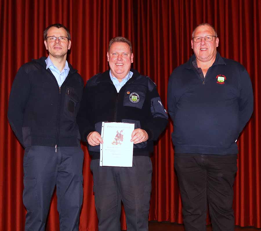 Wehrführer Eike Kroganski berichtete von 76 Einsätzen was eine Steigerung von über 30 % zum Vorjahr bedeutet. 11 mal musste man zu Brandeinsätzen und 30 mal zu technischen Hilfeleistungen ausrücken. Die Zahl der Fehlalarme stieg von 3 auf 16 an, dazu kamen noch Brandsicherheitswachdienste und Absicherungen von Fest- und Laternenumzügen. Insgesamt wurden 152 Einsatzstunden geleistet, was 1.680 Personalstunden ergibt. Zahlreichen Aus- und Fortbildungen haben die Einsatzkräfte absolviert. Auch für Wehrführer Eike Kroganski war es der letzte Tätigkeitsbericht. In einer separaten Versammlung wurde kürzlich eine neue Wehrleitung gewählt. Kroganski trat nach 4 Jahren Stellvertretender – und 10 Jahren als Wehrführer nicht mehr zur Wahl an. Sein Nachfolger ist Oliver Senft mit den Stellvertretern Steffen Franz und Bastian Hepp. Das Führungstrio wird zu Jahresbeginn ihre Arbeit aufnehmen.