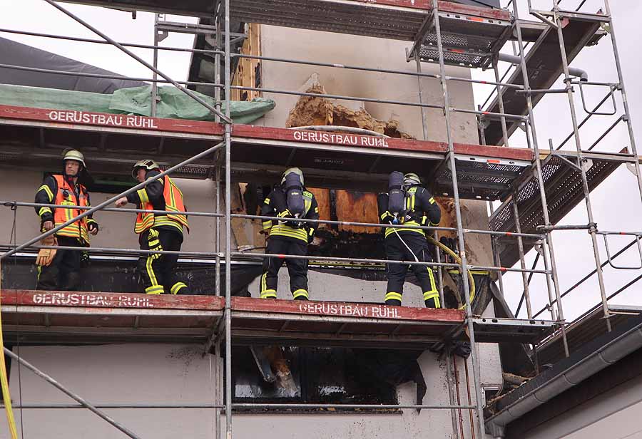 Die Einsatzkräfte wurden erneut zu dem Objekt gerufen, wo sie vor einer Woche ein Feuer bekämpft haben. Hier hatte sich in der Außenwand ein Brand entwickelt. Vermutlich haben sich unentdeckte Glutnester neu entzündet, Genaueres wird ermittelt. Die Feuerwehr öffnete die Außenfassade und entfernte die Dämmung um diese abzulöschen. Teilweise konnten die Arbeiten nur unter Atemschutz vorgenommen werden. Der Einsatz dauerte mehrere Stunden